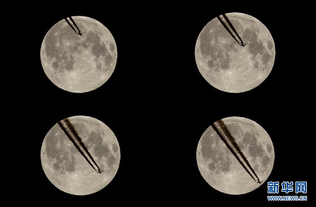 4月27日,一架飛機(jī)“飛過(guò)”法國(guó)巴黎上空的“超級(jí)月亮”(拼版照片)。新華社發(fā)(奧雷利安·莫里薩爾攝)