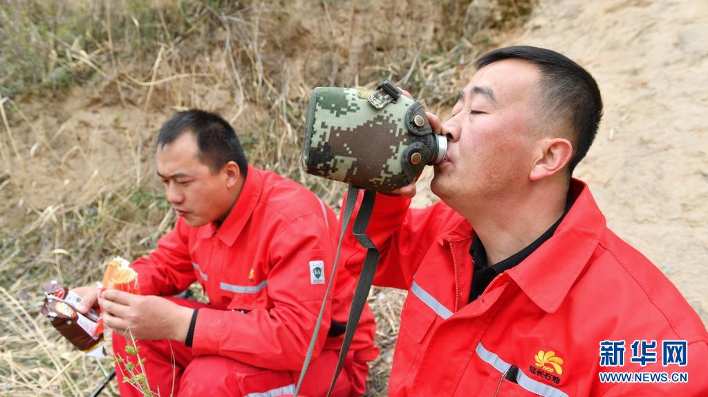 4月27日,巡線隊(duì)員張偉偉(左)、張浩軍在巡線途中吃飯。新華社記者 張博文 攝