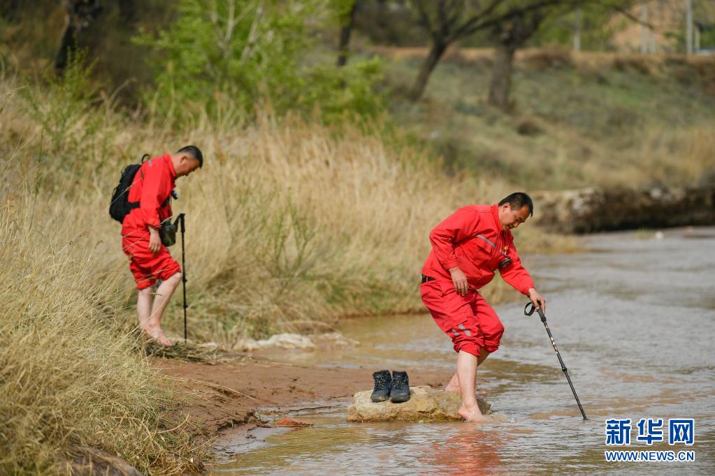 4月27日,巡線隊(duì)員張偉偉(右)、張浩軍巡線途中在河邊洗腳。新華社記者 張博文 攝