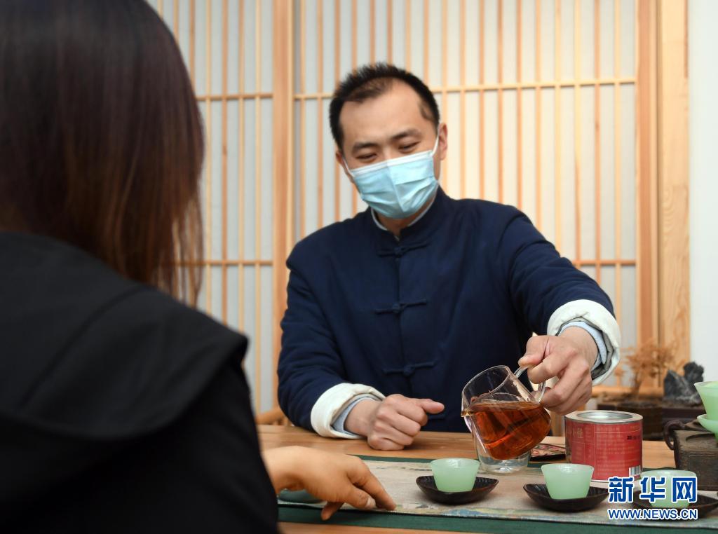 李卓澄在“小茶館”為客人倒茶(4月29日攝)。新華社記者 趙婷婷 攝