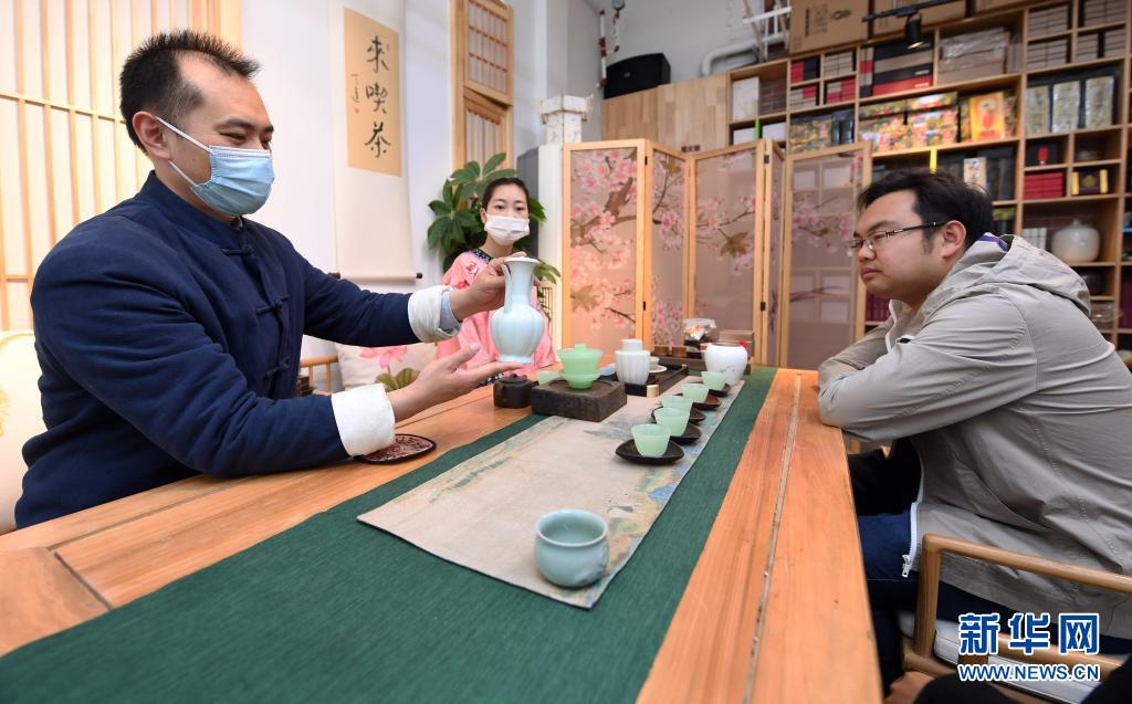 李卓澄(左一)在“小茶館”為客人介紹茶具(4月29日攝)。新華社記者 任超 攝