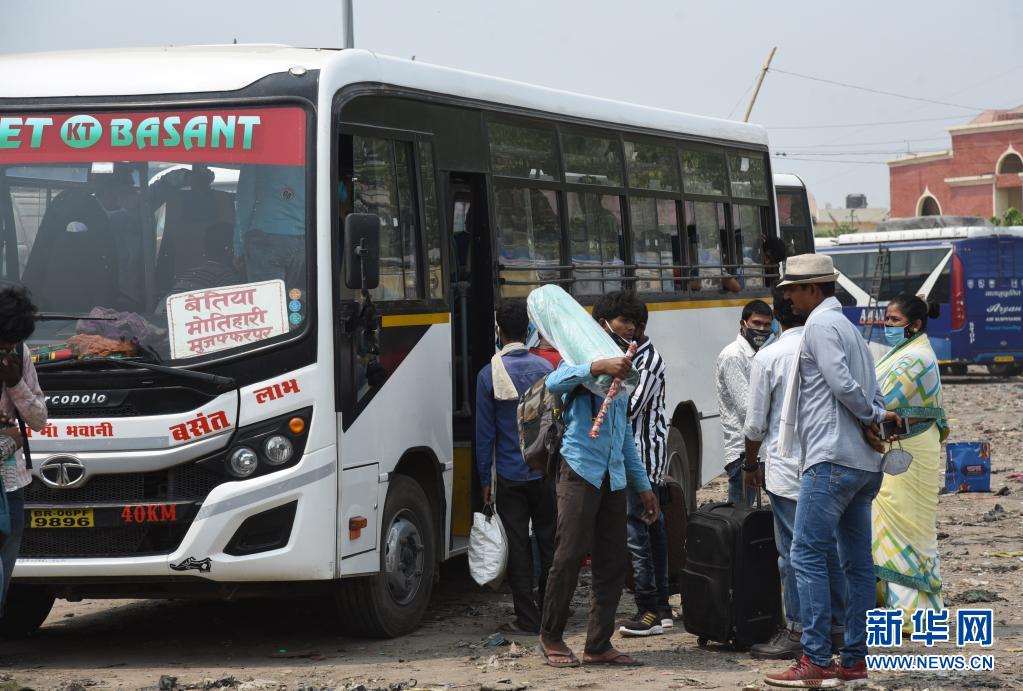 5月5日,印度比哈爾邦宣布實(shí)施封鎖措施后,人們?cè)谟《劝吞啬瞧囌緶?zhǔn)備乘坐巴士返回家鄉(xiāng)。