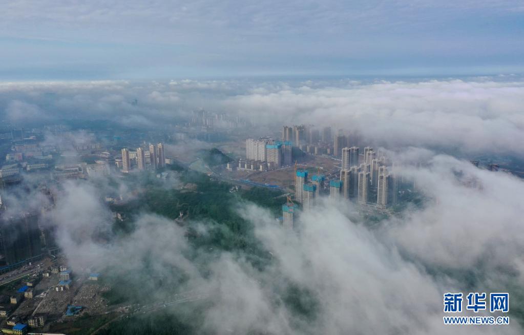 5月8日,貴陽市觀山湖區(qū)的高樓被霧氣籠罩(無人機照片)。