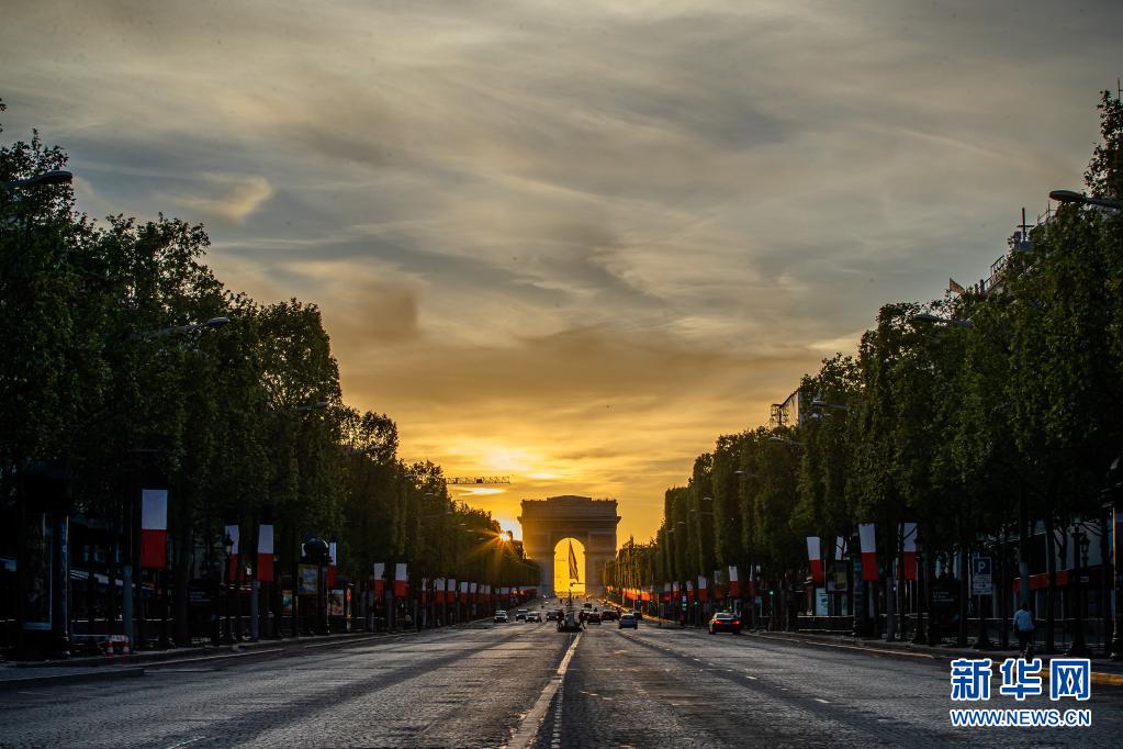 這是5月8日在法國(guó)巴黎香榭麗舍大街拍攝的凱旋門(mén)落日景象。
