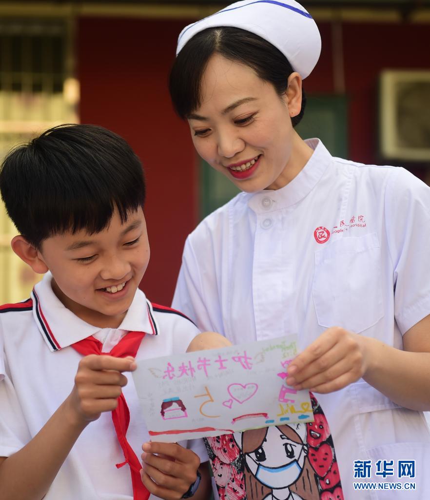 5月11日,河北省滄州市新華區(qū)車(chē)站小學(xué)學(xué)生為滄州市人民醫(yī)院的護(hù)士阿姨送上美術(shù)作品,表達(dá)敬意。