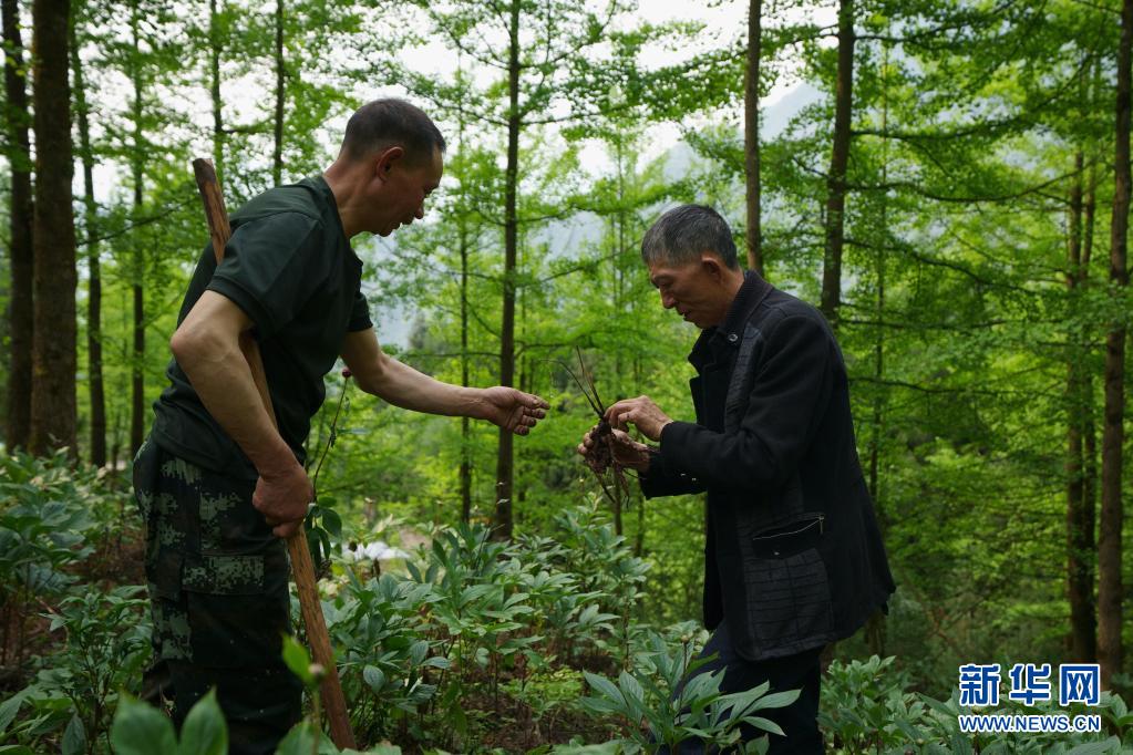 5月4日,村里的林下種植大戶(hù)鄧建述(右)在幫林興聰分析林下種植的藥材生病的原因。 新華社記者 江宏景 攝