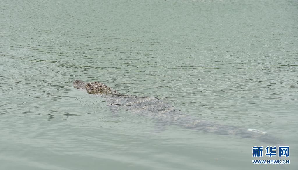 5月13日,放歸的揚子鱷在水塘內(nèi)活動。