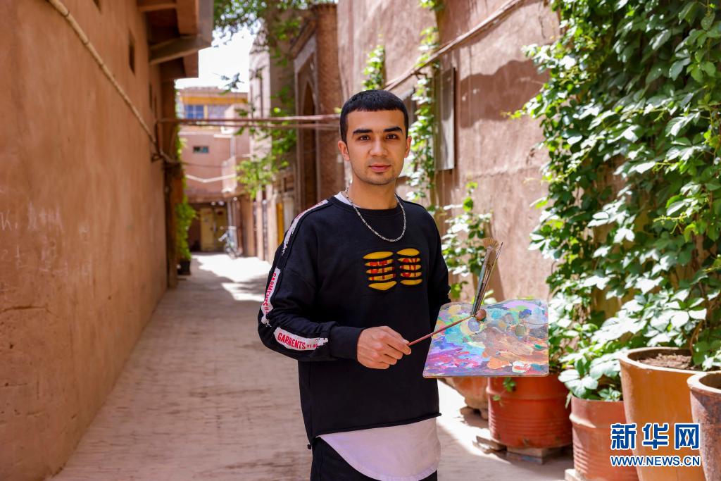這是在新疆喀什古城景區(qū)的小巷內(nèi)拍攝的青年畫(huà)家麥麥提吐?tīng)栠d江·麥麥提依明(5月8日攝)。新華社記者 胡虎虎 攝