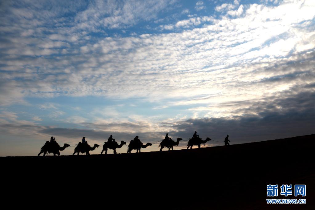 5月15日,游客騎駱駝在甘肅省敦煌市鳴沙山月牙泉景區(qū)游覽。晨光下,云彩、沙山、駝隊構成了一幅美麗迷人的畫卷。新華社發(fā)(張曉亮 攝)