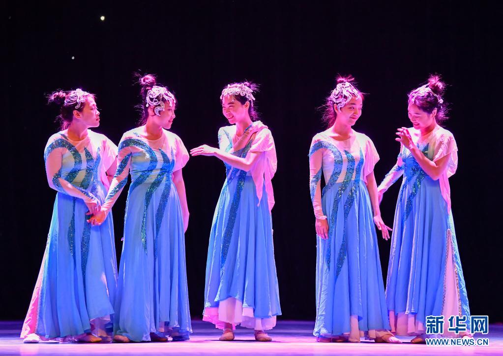 在天津理工大學(xué)的劇場里,天津理工大學(xué)聾人工學(xué)院的舞蹈隊(duì)員們?cè)诓逝砰g隙用手語交流(5月10日攝)。新華社發(fā)(孫凡越攝)