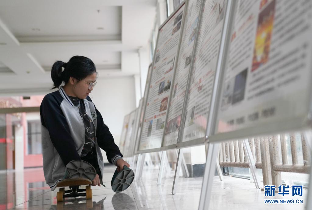 2021年5月11日,蔣張子怡在學校的走廊內(nèi)閱覽海報。