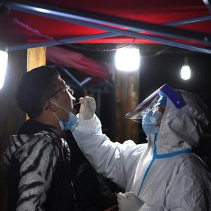 5月16日晚,在肥西縣上派鎮(zhèn)一小區(qū),工作人員為居民進行核酸采樣。