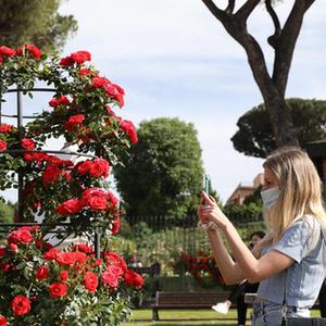 5月17日,人們?cè)谝獯罄锥剂_馬玫瑰園游覽。