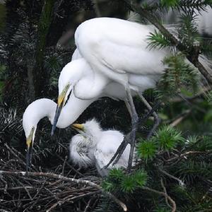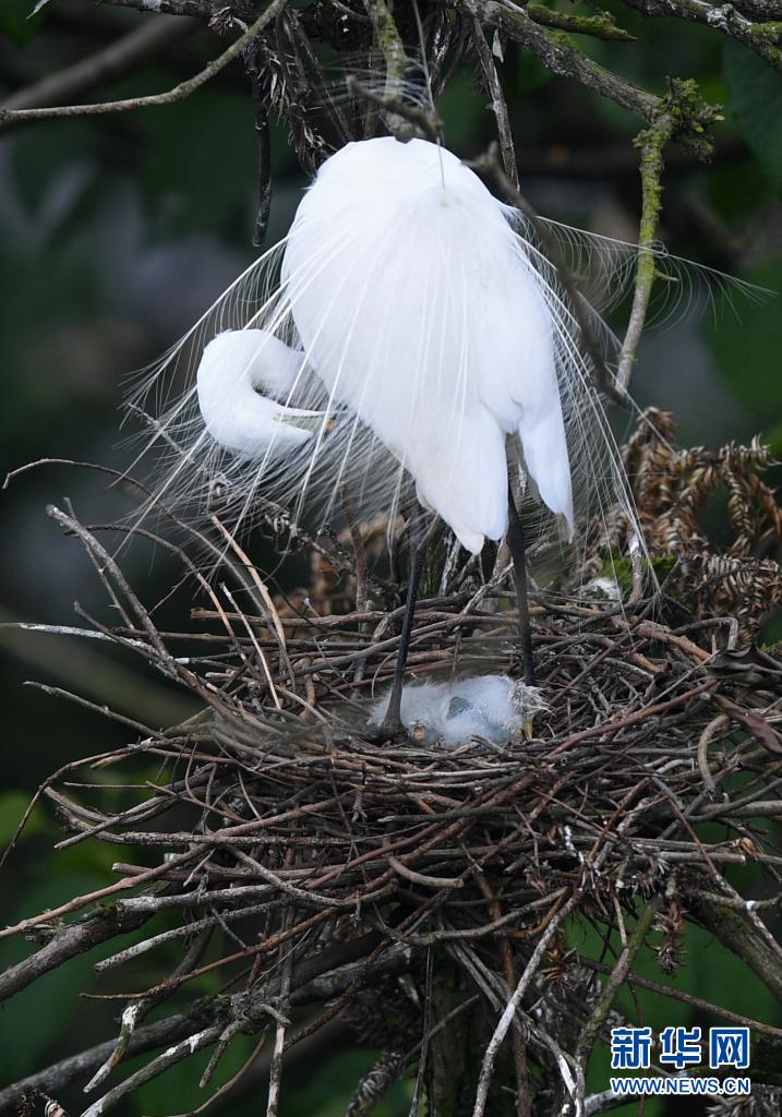 在南昌市新建區(qū)象山森林公園內(nèi),白鷺守護著雛鳥(5月18日攝)。