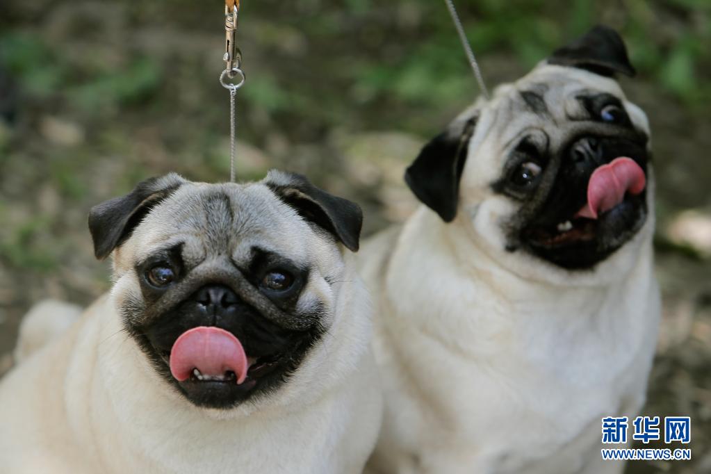 5月23日,兩只巴哥犬在羅馬尼亞首都布加勒斯特參加選美比賽。新華社發(fā)(克里斯泰爾攝)