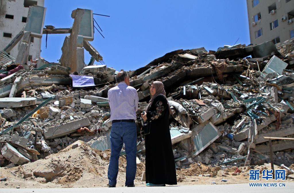 5月23日,巴勒斯坦人在加沙城望著遭以軍空襲損毀的賈拉塔。5月10日以來,以色列與加沙地帶武裝組織之間爆發(fā)嚴(yán)重沖突。20日晚,哈馬斯與以色列方面各自宣布,雙方已達(dá)成?;饏f(xié)議,?;饛?1日凌晨開始。新華社發(fā)(里澤克·阿卜杜勒·賈瓦德攝)