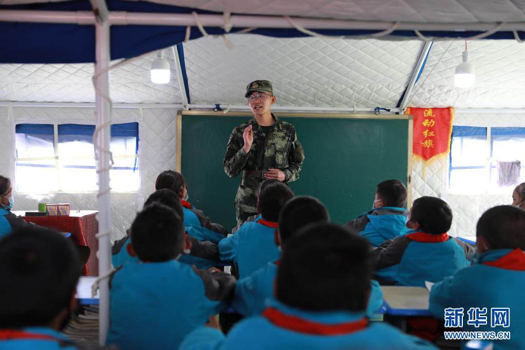 5月24日,武警青??傟?duì)果洛支隊(duì)機(jī)動(dòng)大隊(duì)排長張國睿為花石峽鎮(zhèn)藏文中心寄宿制小學(xué)的孩子上課。新華社記者 劉芳 攝