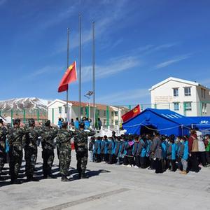 當(dāng)日是青海果洛瑪多縣花石峽鎮(zhèn)藏文中心寄宿制小學(xué)震后復(fù)學(xué)第一天,學(xué)校邀請他以“國家、奮斗、團(tuán)結(jié)”為主題,和孩子們進(jìn)行交流。