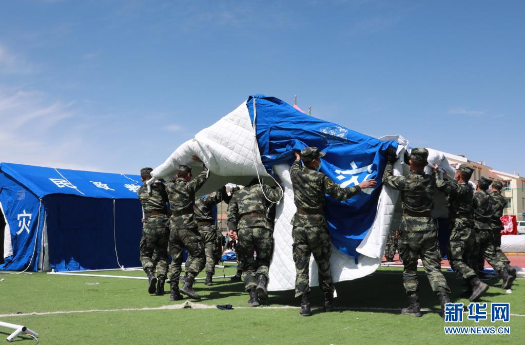 5月24日,武警青海總隊(duì)果洛支隊(duì)機(jī)動(dòng)大隊(duì)官兵為花石峽鎮(zhèn)藏文中心寄宿制小學(xué)搭建帳篷教室。新華社記者 劉新 攝