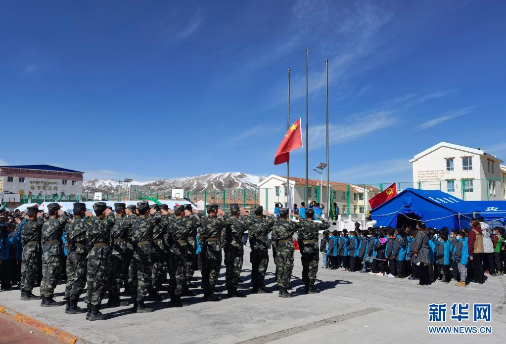 5月24日,武警青??傟牴逯ш牂C(jī)動大隊官兵與花石峽鎮(zhèn)藏文中心寄宿制小學(xué)的師生一同參加升國旗儀式。新華社發(fā)(宦爵才郎 攝)