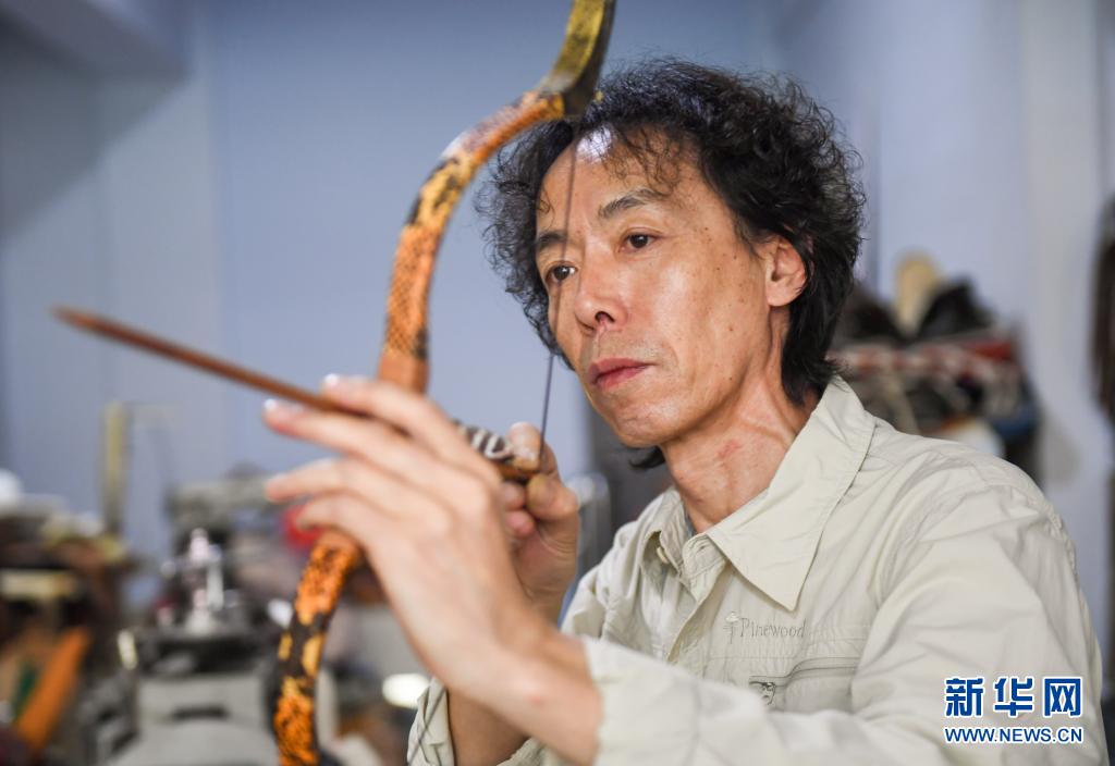 5月26日,錫林虎在工作室內(nèi)制作弓箭造型的手工藝品。