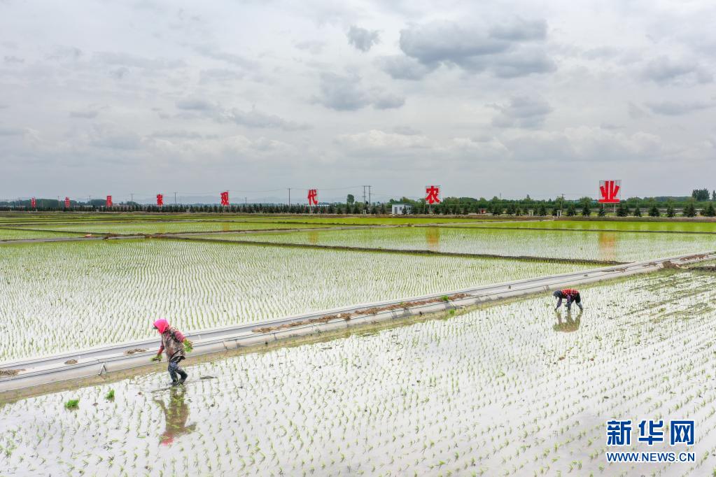 5月26日,在吉林省吉林市永吉縣萬昌鎮(zhèn)宇豐米業(yè)2萬畝高標(biāo)準(zhǔn)水田基地,農(nóng)民進行水稻補苗工作(無人機照片)。