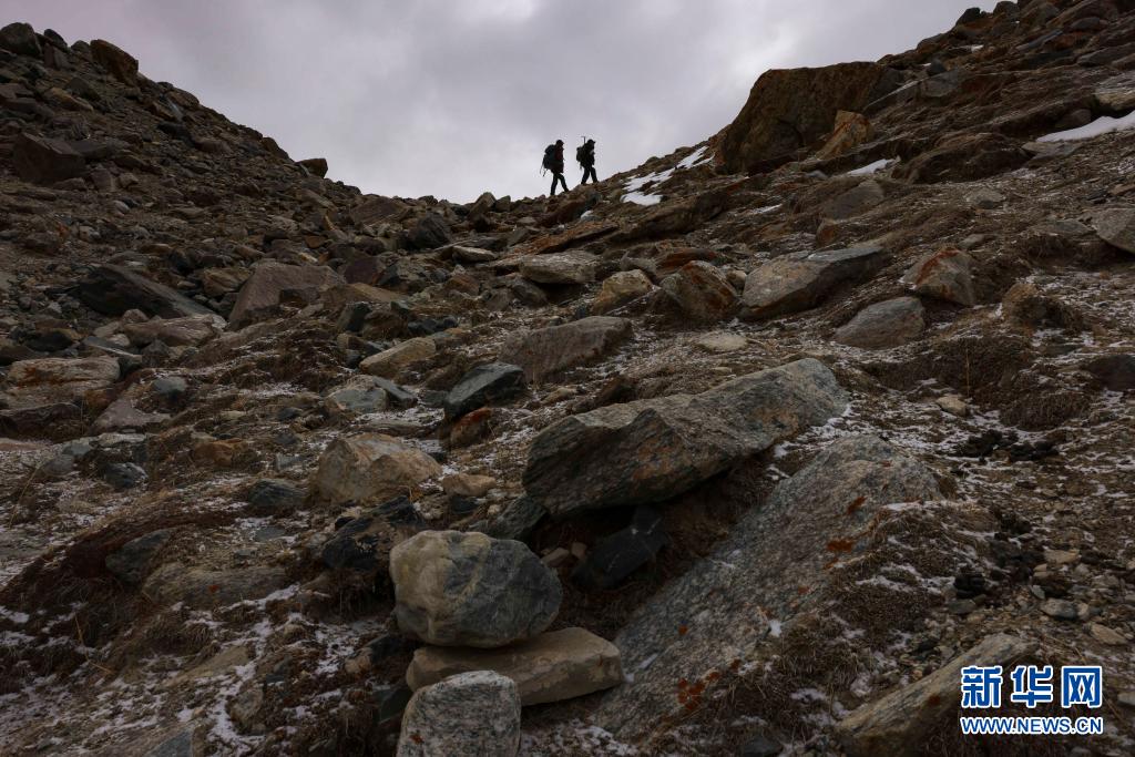 在慕士塔格峰大本營(yíng)附近,別克米爾扎·圖爾達(dá)力(右)和同伴庫(kù)爾班巴依·努爾麥麥提翻越一處陡坡(5月16日攝)。新華社記者 胡虎虎 攝