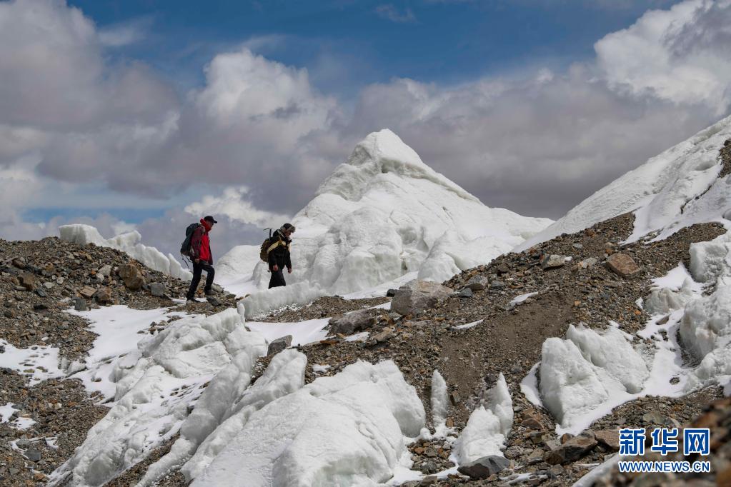 別克米爾扎·圖爾達(dá)力(右)和同伴庫(kù)爾班巴依·努爾麥麥提在適應(yīng)性練習(xí)中從冰川旁經(jīng)過(guò)(5月16日攝)。新華社記者 胡虎虎 攝