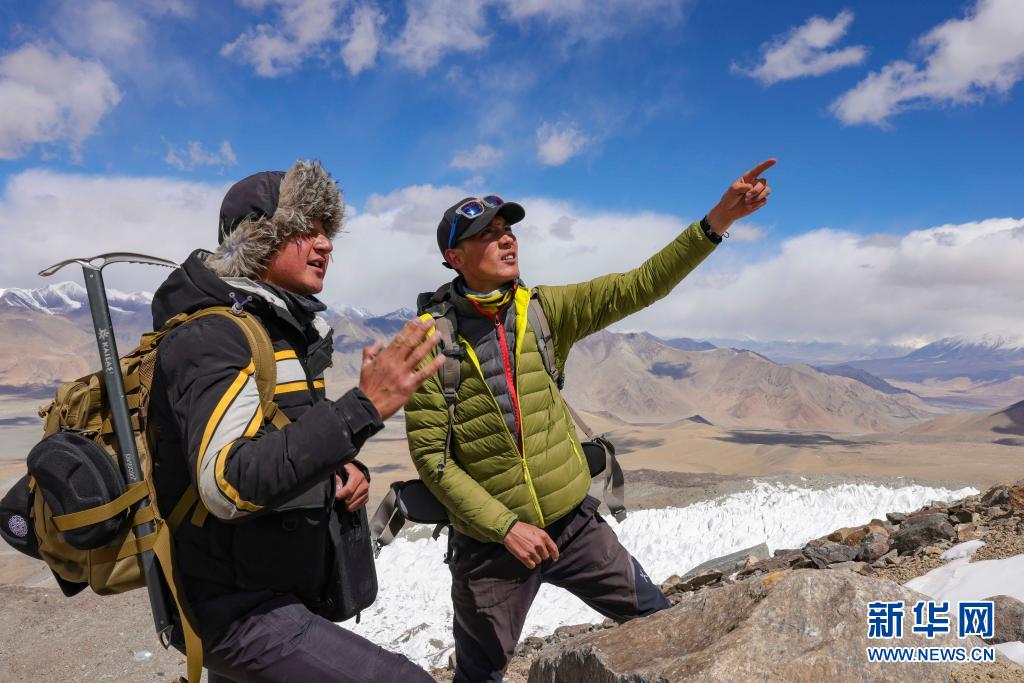 別克米爾扎·圖爾達(dá)力(左)和同伴庫(kù)爾班巴依·努爾麥麥提在討論登山前進(jìn)線路(5月15日攝)。新華社記者 胡虎虎 攝