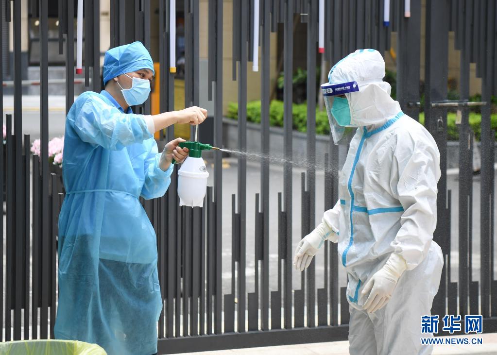 5月27日,在廣州荔灣區(qū)白鶴洞街道一小區(qū)檢測點,荔灣區(qū)骨傷科醫(yī)院的醫(yī)護人員給換班下來的同事噴灑消毒液。新華社記者 鄧華 攝