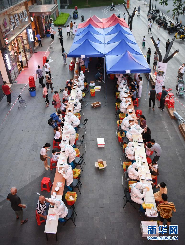 5月27日,在廣州荔灣區(qū)廣鋼新城核酸臨時采集點,南方醫(yī)科大學(xué)南方醫(yī)院的醫(yī)務(wù)人員進行核酸檢測采樣。新華社記者 鄧華 攝