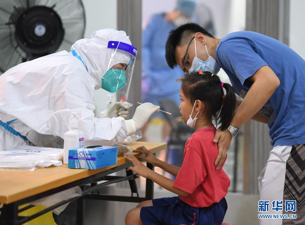 5月26日,在廣州荔灣體育館核酸檢測(cè)點(diǎn),小朋友在家人的陪伴下進(jìn)行核酸檢測(cè)采樣。新華社記者 鄧華 攝