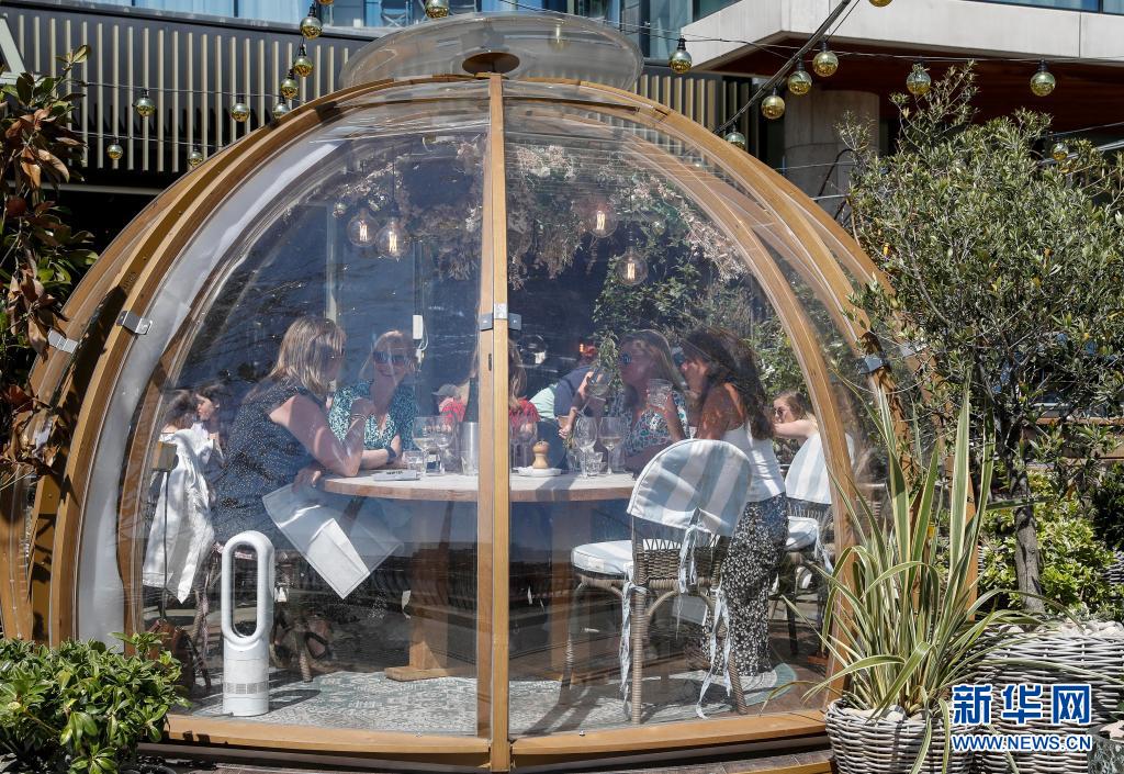 6月1日,人們?cè)谟?guó)倫敦一家餐廳戶(hù)外就餐區(qū)的“泡泡屋”就餐。
