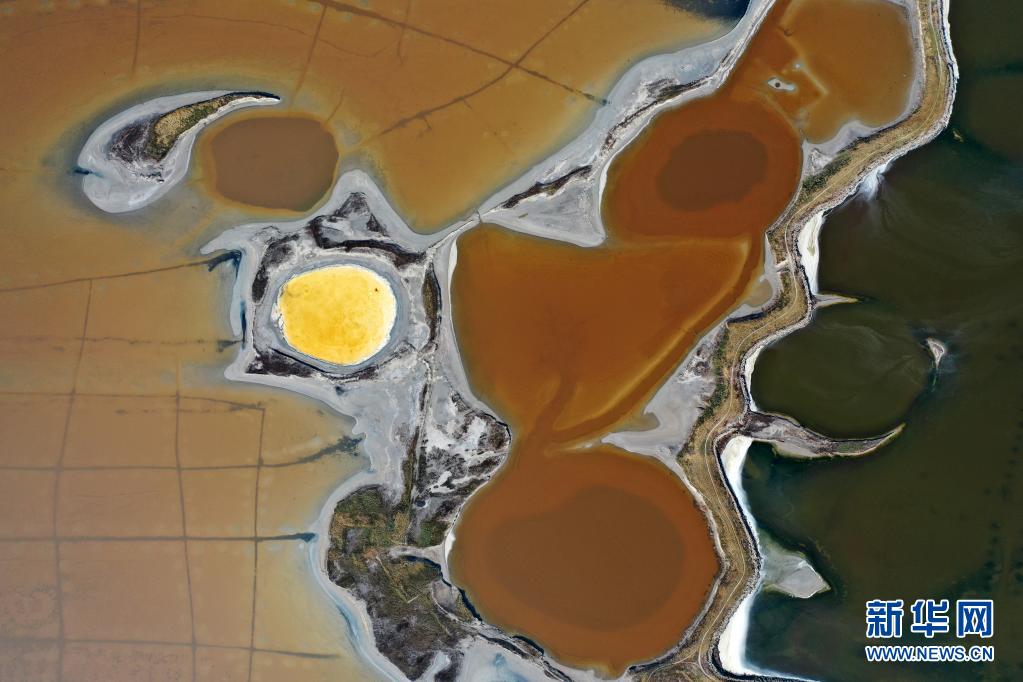 近日,隨著氣溫不斷升高,山西運(yùn)城鹽湖呈現(xiàn)五彩斑斕的景象。
