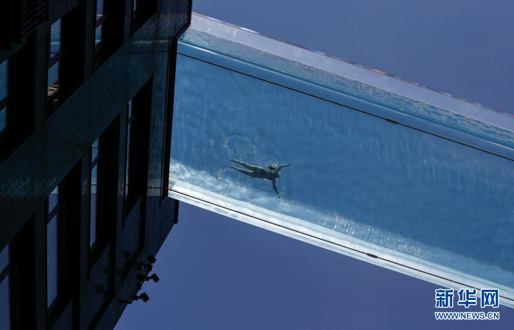6月2日,一名女子在英國倫敦南部一個建造于兩棟公寓樓之間的“空中泳池”游泳。