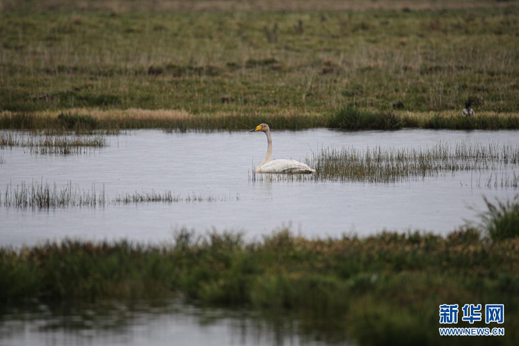 這是6月2日在甘肅省甘南藏族自治州碌曲縣尕海湖拍攝的國家二級保護動物大天鵝。