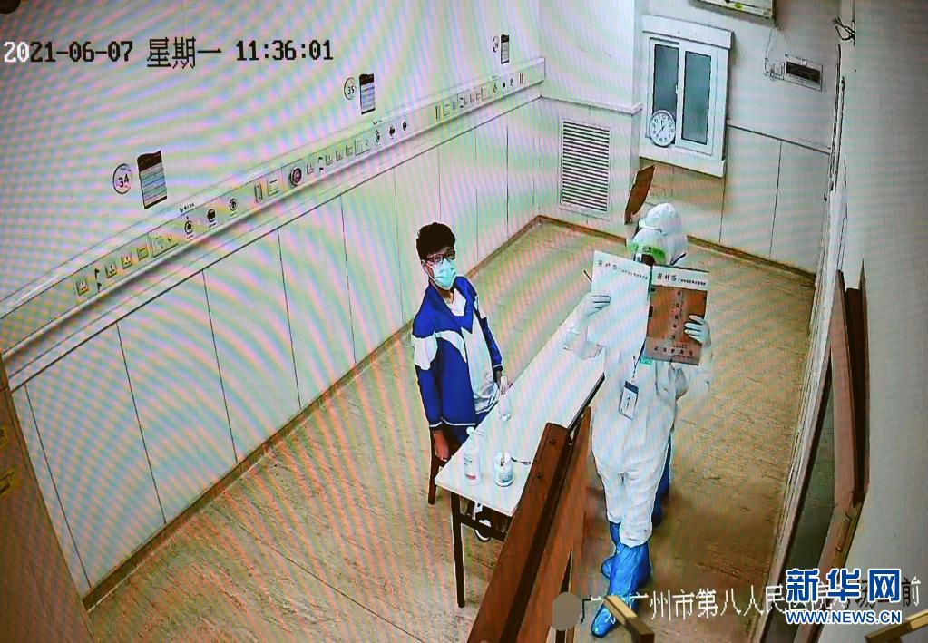 6月7日,廣東省國家教育考試指揮中心的監(jiān)控畫面顯示,上午語文考試結(jié)束后,廣州市八醫(yī)院嘉禾院區(qū)醫(yī)護(hù)人員對隔離病房考生的試卷、答題卡、稿紙等用品進(jìn)行消毒后裝入試卷袋并向在醫(yī)院清潔區(qū)的視頻監(jiān)考員匯報。新華社記者 劉大偉 攝