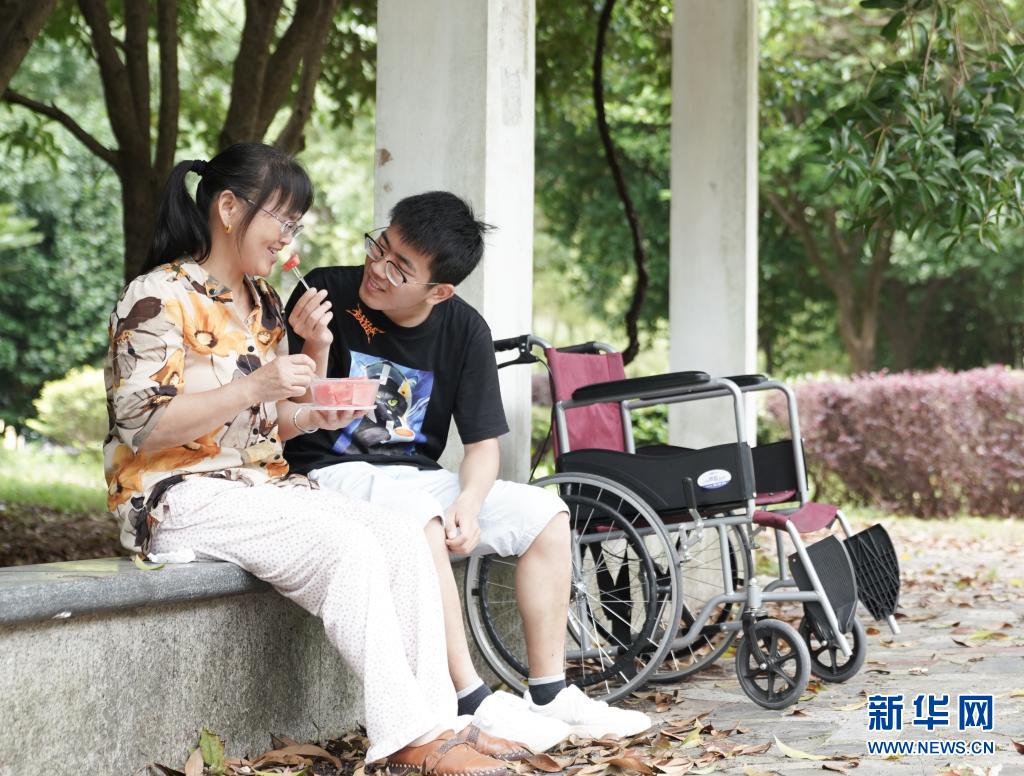 6月1日,趙建軍和母親在校園內吃西瓜。新華社記者胡晨歡攝