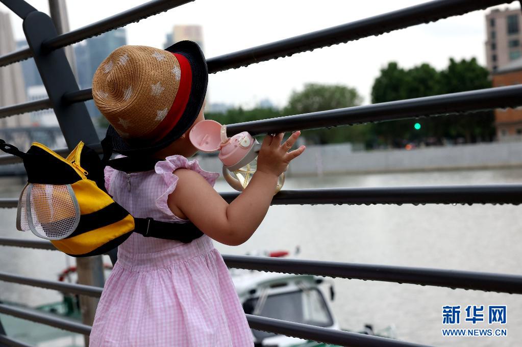 6月10日,一名小朋友在雨后的上海蘇州河乍浦路橋附近玩耍。
