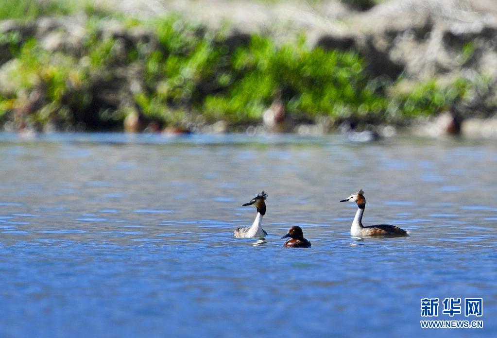 6月14日在拉魯濕地拍攝的兩只鳳頭??和一只小??(中)。夏日里,鳳頭??和小??在西藏拉薩拉魯濕地國(guó)家級(jí)自然保護(hù)區(qū)水面上嬉戲。新華社記者 張汝鋒 攝