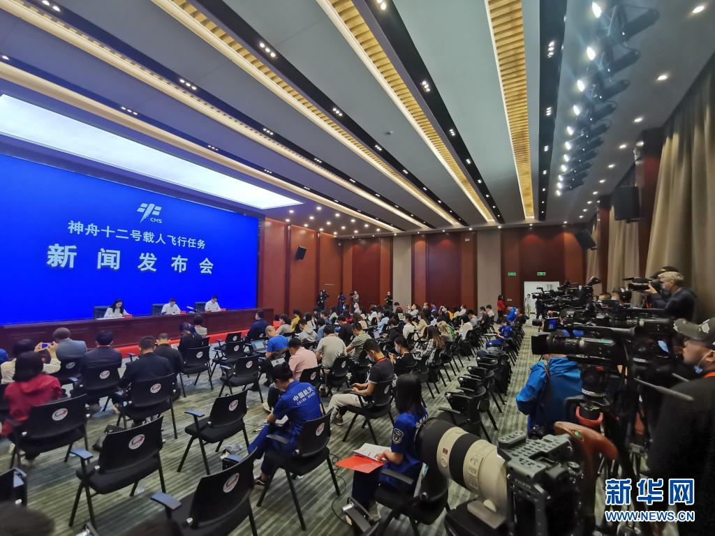 6月16日,神舟十二號載人飛行任務新聞發(fā)布會在酒泉衛(wèi)星發(fā)射中心召開(手機拍攝)。