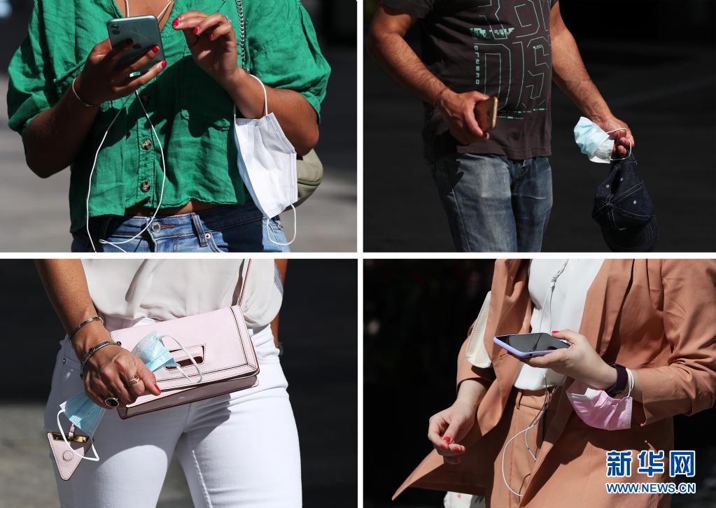 這張拼版照片顯示,6月17日,人們拿著口罩走在法國巴黎香榭麗舍大街上。
