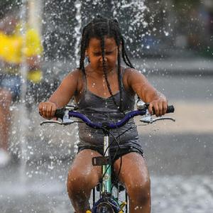 6月17日,在德國(guó)法蘭克福,一名小朋友騎車(chē)穿過(guò)噴泉納涼。