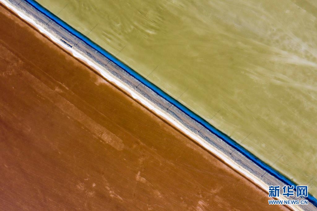 這是在新疆和布克賽爾蒙古自治縣瑪納斯鹽湖中鹽宏達(dá)鹽業(yè)生產(chǎn)基地拍攝的一處灘曬池(6月21日攝,無(wú)人機(jī)照片)。