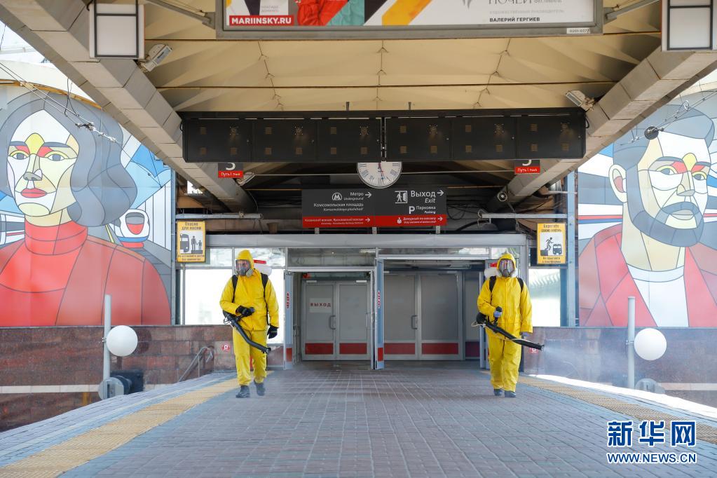 6月24日,工作人員身著防護(hù)服在俄羅斯莫斯科一個火車站進(jìn)行消毒作業(yè)。