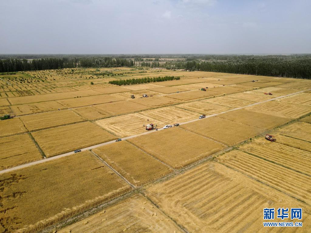 6月19日,空中俯瞰麥客阿地力·沙拉木工作的新疆庫車市齊滿鎮(zhèn)的麥?zhǔn)宅F(xiàn)場(無人機照片)。新華社記者 高晗 攝