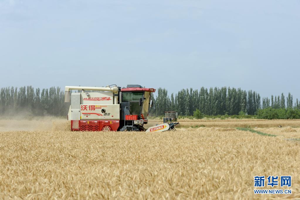 在新疆庫車市的麥田里,麥客阿地力·沙拉木的聯(lián)合收割機(jī)正在收割小麥(6月19日攝)。新華社記者 高晗 攝