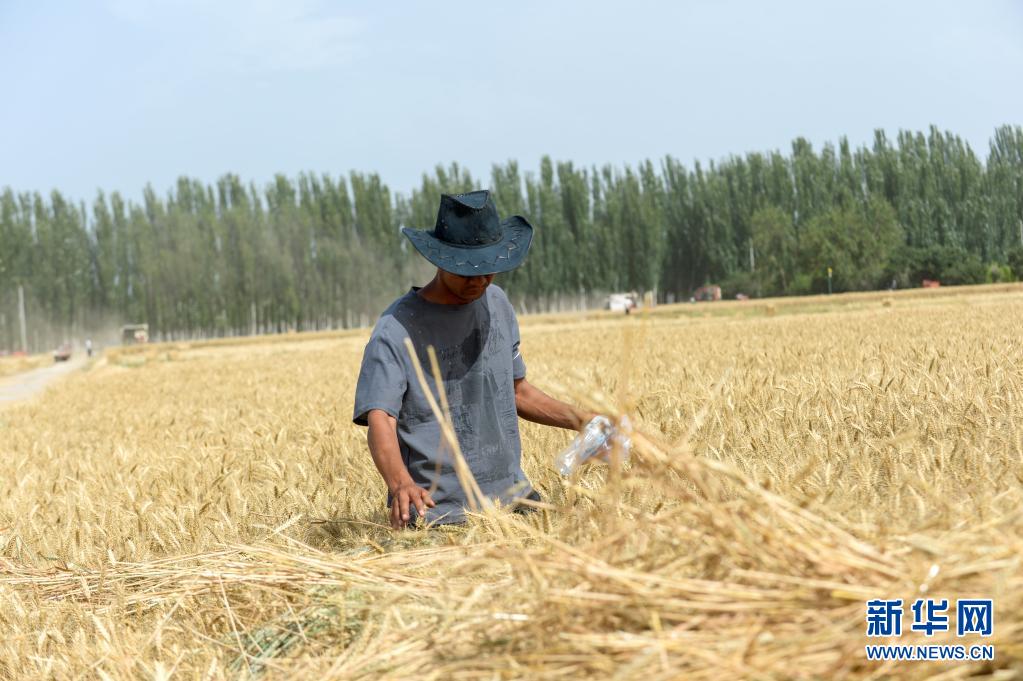 麥客阿地力·沙拉木在麥田間查看小麥長勢(6月19日攝)。新華社記者 高晗 攝