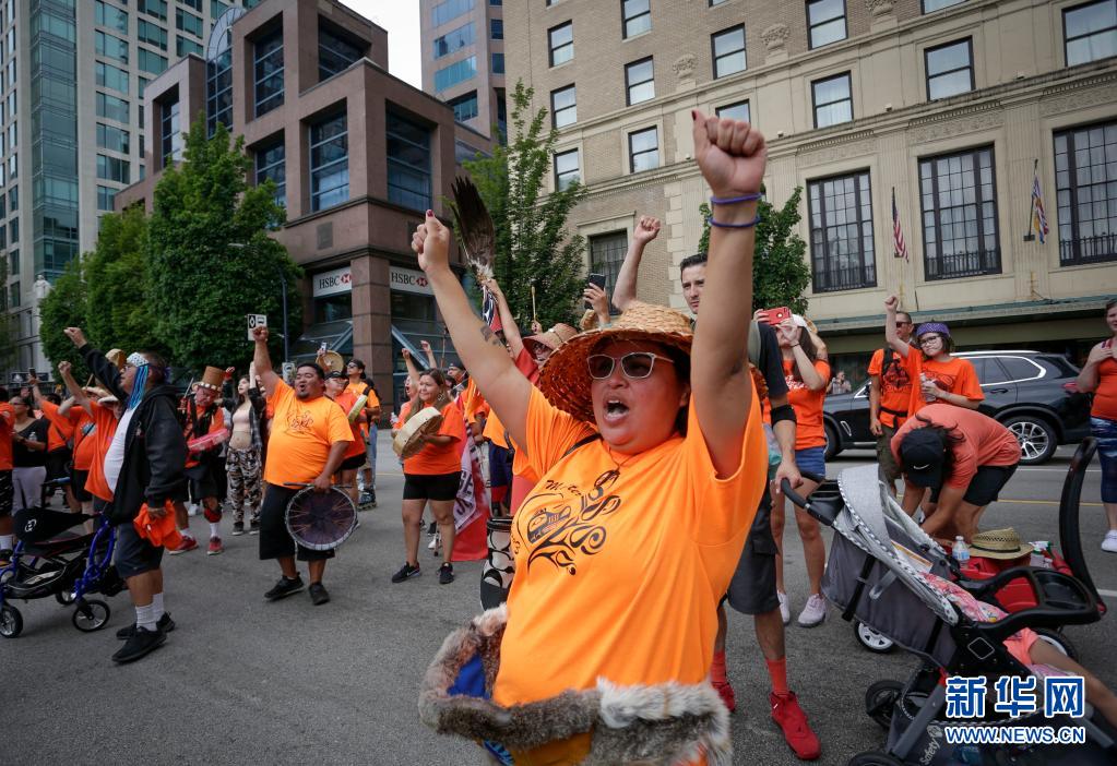 當(dāng)天是加拿大日,上千名抗議者在溫哥華集會,悼念加拿大在強制“同化”原住民過程中遭到殘害的兒童,呼吁取消加拿大日的慶祝活動。