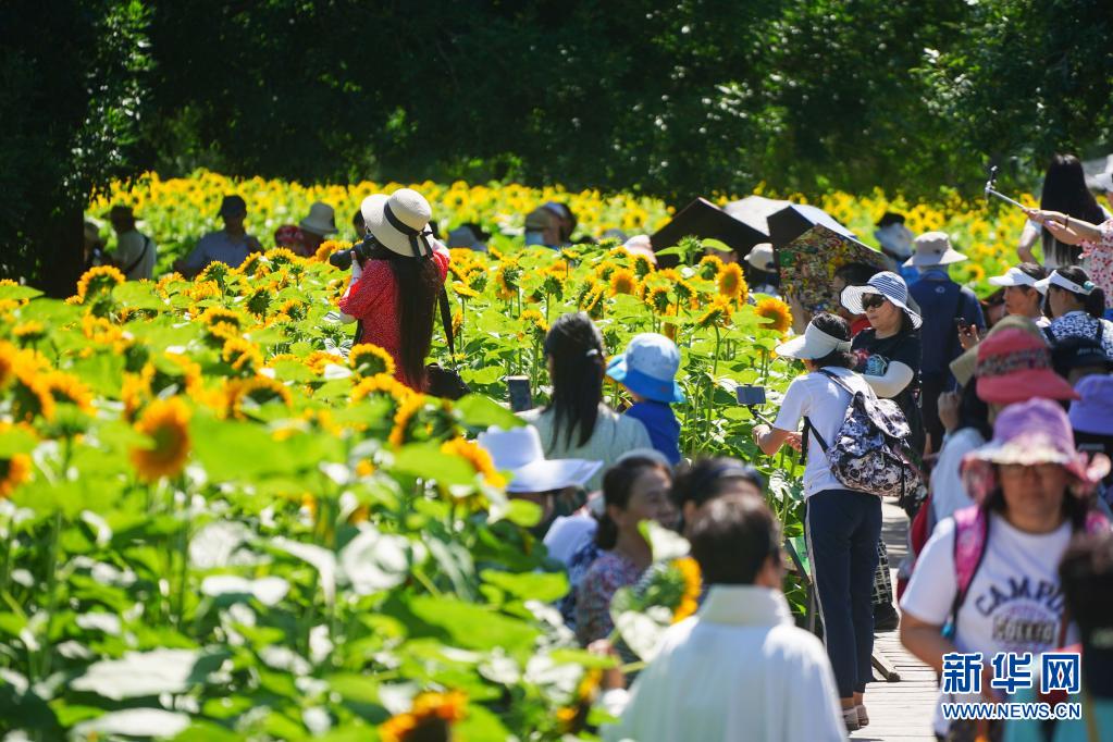 7月4日,游客在北京奧林匹克森林公園北園觀賞向日葵。